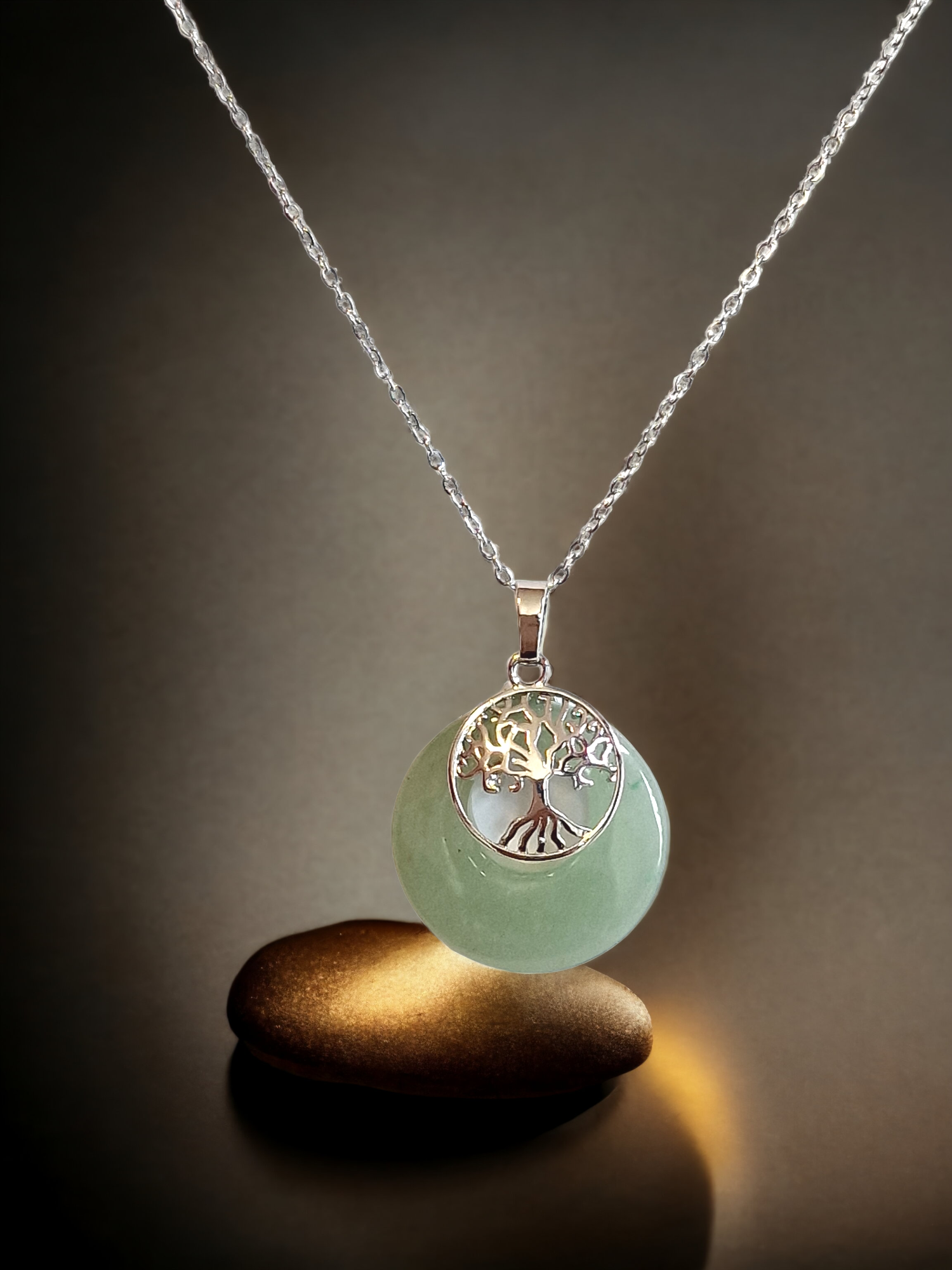 Collier en acier inoxydable et pendentif arbre de vie médaille aventurine verte